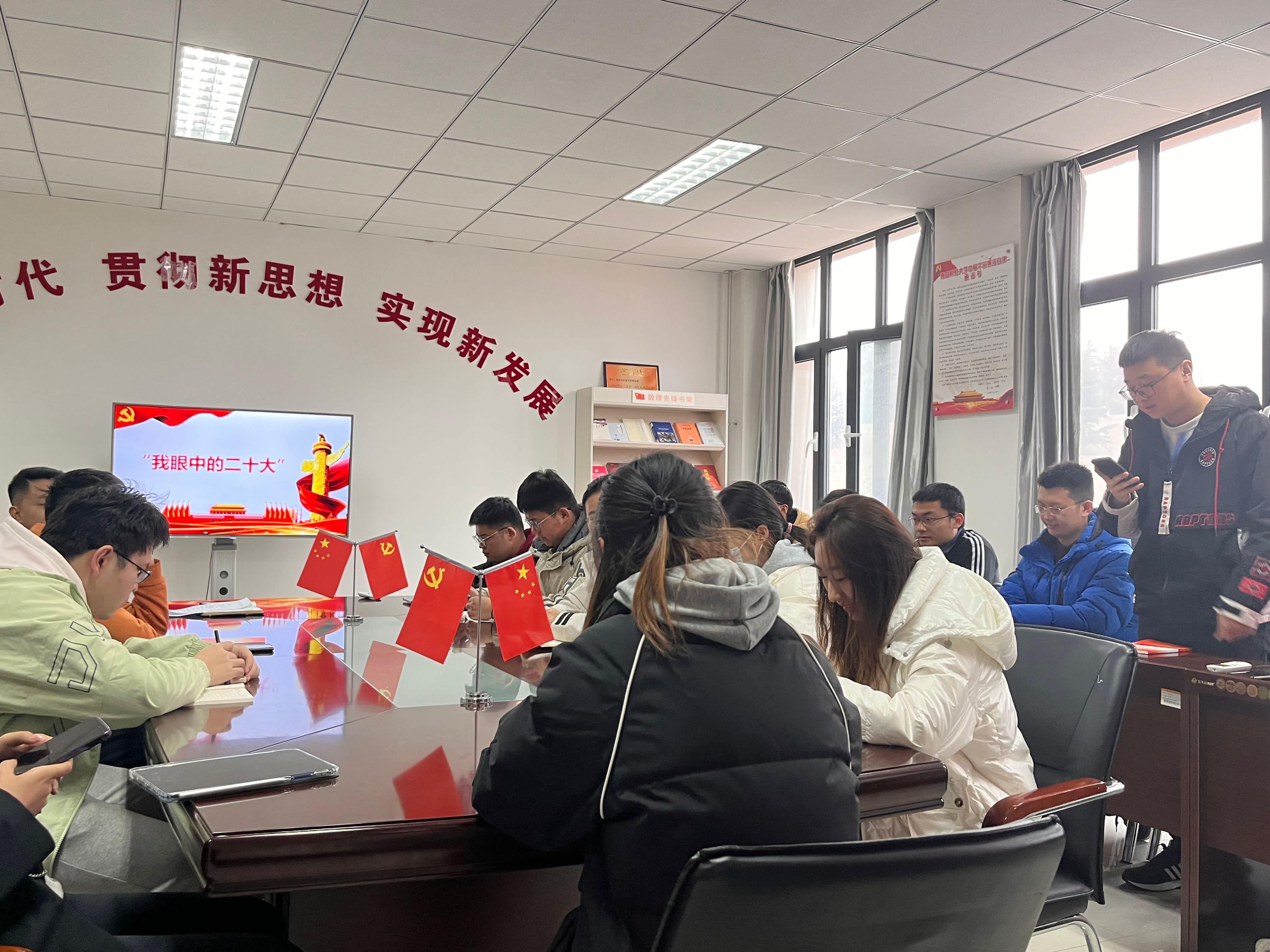 学生党员重温党的二十大报告,冯若菲等学生党员各自分享了自己对二十大的理解与感悟——“对统筹推进“五位一体”总体布局,为新时代新征程党和国家事业发展、实现第二个百年奋斗目标指明了前进方向、确立了行动指南”、“坚持立足实践、守正创新,在思想理念、政策举措上既继承和弘扬优良传统,又勇于创新,提出新论断、新要求”、“把伟大建党精神继承下去、发扬光大,不断从中汲取真理力量、实践力量、人格力量,坚守初心使命,始终保持谦虚谨慎、艰苦奋斗的政治本色”。党员们述说着眼中的二十大,思想碰撞产生了深切的共鸣。