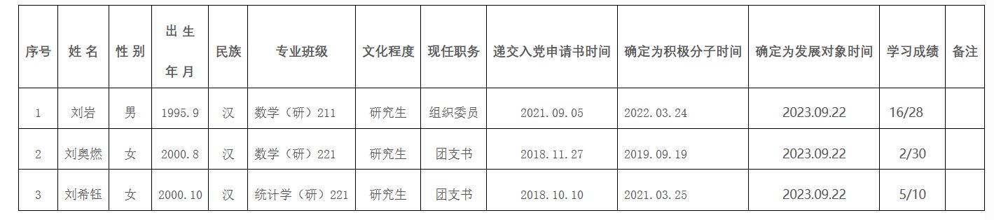 根据本人申请,党组织培养,经自拍流出 研究生党支部委员会研究、支部大会讨论并不记名投票表决,拟吸收刘岩、刘奥燃、刘希钰三位同志为中共预备党员,现将其有关情况予以公示。