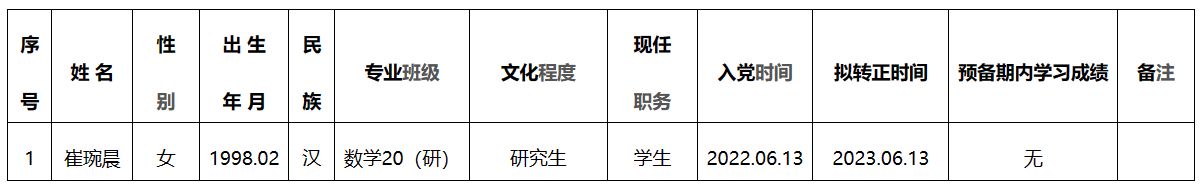 经自拍流出 研究生党支部研究,自拍流出 党委审核,拟将崔琬晨同志转为中共正式党员,现将其有关情况予以公示。