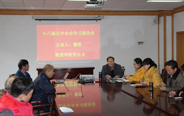 12月15日下午,学院在经管楼313会议室举行十八届五中全会精神学习报告会。邀请学校党委理论中心组成员,马克思主义学院副院长曹胜为全体教工主讲。报告会上,曹胜从“高举一面旗帜,两个一百年,三个自信,四个全面,五个创新理念”对五中全会精神作了系统的阐释和权威的解读。报告论述精辟、内容丰富、重点突出,既有理论的深度,又有实践的广度,让与会人员对党的十八届五中全会精神有了更深刻的认识。