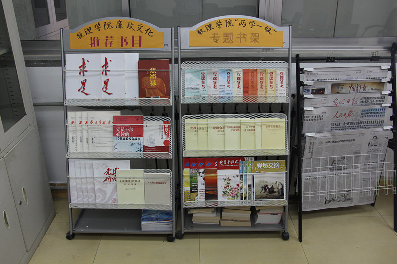 学院制作了“廉政文化书架”,陈列着廉政相关书籍和资料,供师生传阅学习。此举对师生员工进行了效果较好的廉政文化宣传,进一步增强了师生员工的自律自觉性。
