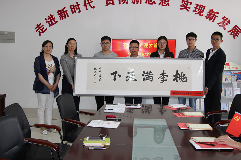 党总支为每位毕业生党员赠送一本《共产党宣言》,扉页上记录了每位毕业生的入党时间和领导、辅导员寄语,希望每位党员同志都能铭记党员身份,牢记入党初心。毕业生党员为学院赠送桃李满天下的牌匾。