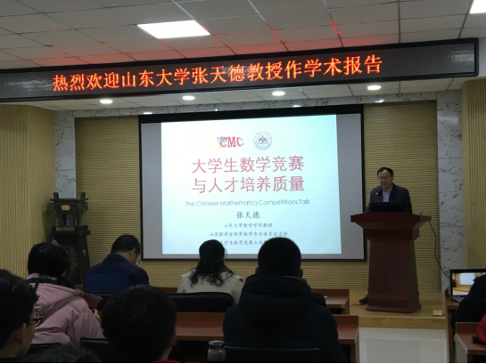 张教授的报告从竞赛与组织、竞赛的准备及相关措施、竞赛获奖与人才培养、阶梯式人才的挖掘与持续性培养四个方面展开,他用幽默的语言和生动的实例阐释了对数学竞赛的认识,进一步明确了数学竞赛基本流程和赛制的公平、公正性。张教授还为同学们备考数学竞赛和考研提供了专业建议,并现场为同学们讲解了部分竞赛模拟题。最后,又就如何撰写申报教学成果立项材料做了生动的讲解,并鼓励教师平时积累资料,勇于创新。