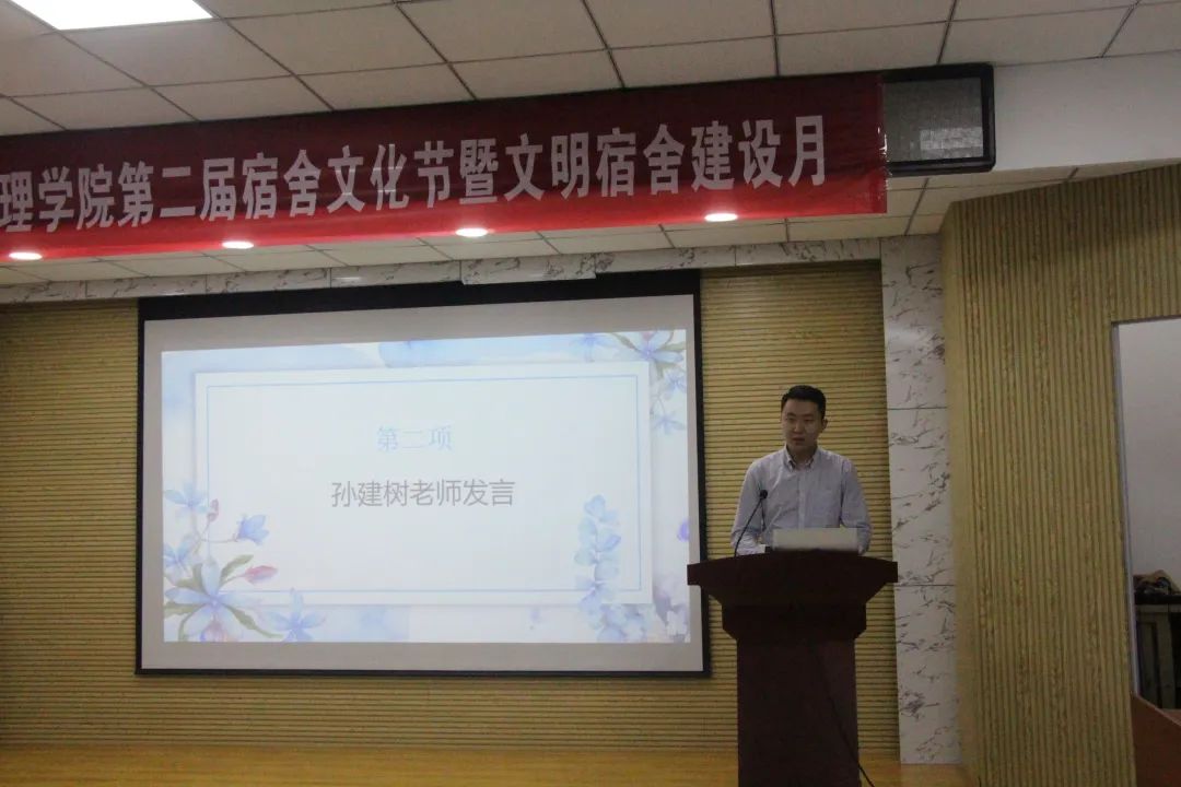 团委孙建树老师介绍本届宿舍文化节的主要活动内容并进行动员。本次宿舍文化节从亮门牌抓验收、亮三色促整改、亮内务评先进等六大内容精心设计,以学生喜闻乐见的趣味方式,加强劳动教育、学风教育、思想政治教育、文明养成教育。