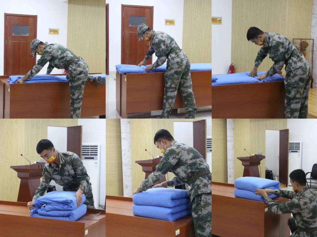 退役军人徐俊治现场教授叠军被。疫情原因,22级新生并未参加军训,通过退役军人的现场教学,师生学到了标准的叠被步骤,进一步提高了内务整理能力。