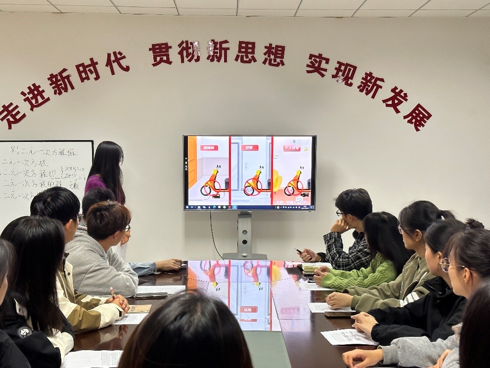 校园内非机动车管理暂行办法》等相关规定,以身边发生的真实案例,引导同学们讨论电动车安全事故发生的原因。通过观看安全用车规范视频来增强同学们对电动车安全的重视,最后大家讨论出一些预防校园交通事故的实用建议,号召同学们从自我做起安全行车,为保障自己和他人的安全出一份力。