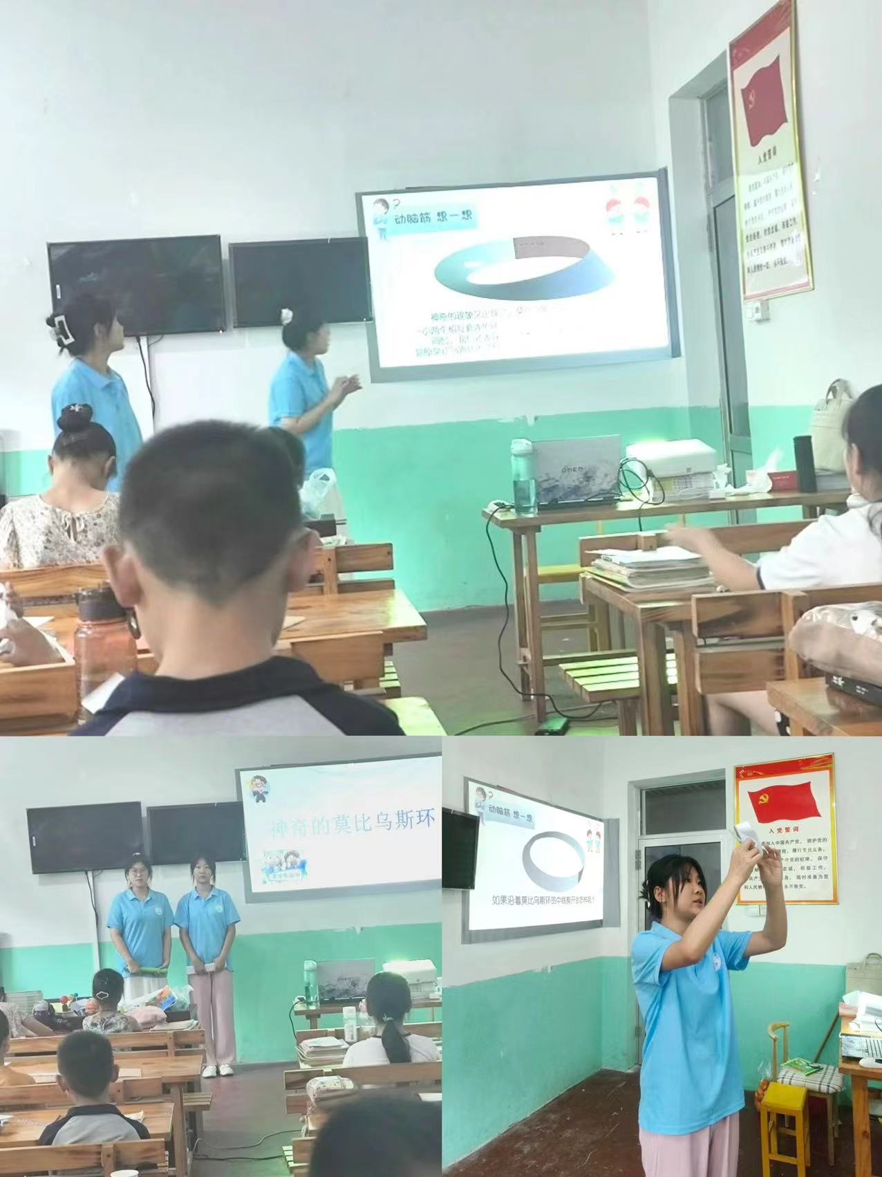 队员们不仅展示了莫比乌斯带的制作,还设计了一系列基于莫比乌斯带性质的小游戏和问题解答环节,如让学生尝试找出莫比乌斯带的“另一面”,以及探讨如果将莫比乌斯带从中间切开会得到什么结果等。这种互动式与问题导向的教学方法,极大地提升了学生们的参与度和兴趣。