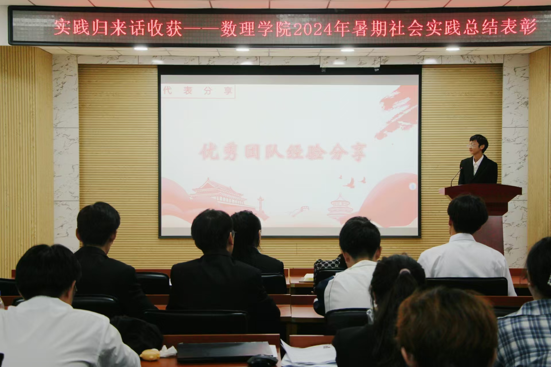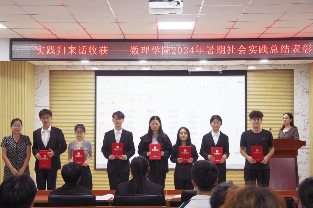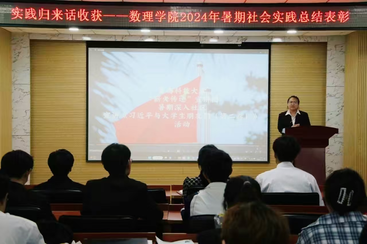 组织召开2024年暑假社会实践总结表彰会。学院党委副书记李雯雯、社会实践指导教师刘敏及各年级社会实践学生代表参加会议。会议对32名获得社会实践优秀学生荣誉称号的学生进行了表彰并授予“实践π”的称号。会上,“青苗助红”实践队队长孙焕溪同学以“促进乡村振兴”为主题,从家乡特色、服务经历、个人感悟等方面做了汇报发言。“薪火传递”宣讲团的队长张梓桐同学全方位展示了个人在暑假进社区领学《习近平与大学生朋友们》的所思所悟。“雷锋式”团支部的成员李志豪同学讲述了“老物件寻访计划”的基本情况,分享自己爱老敬老助老的心路历程。