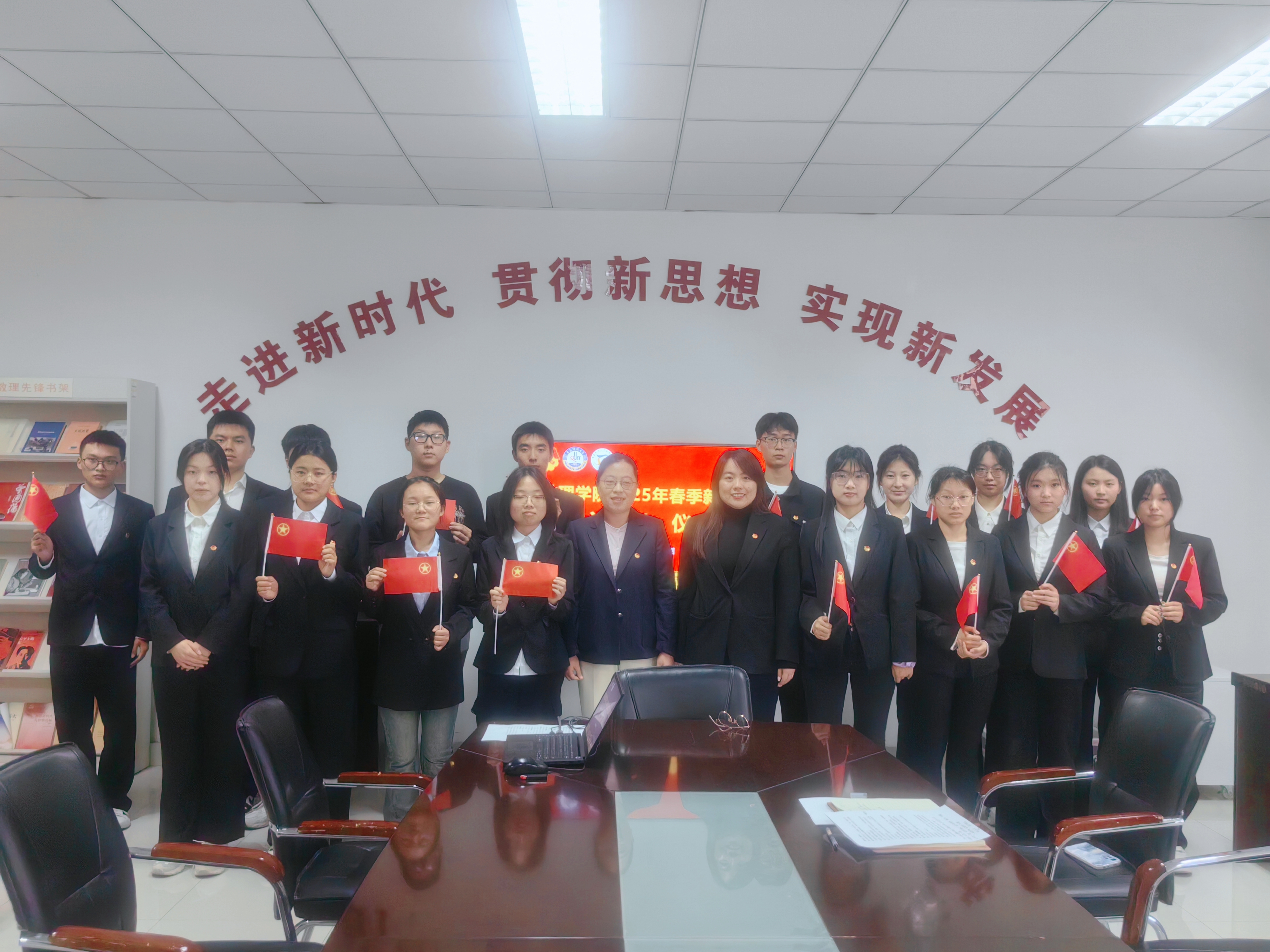 举办2025年春季新团员入团仪式,学院党委副书记李雯雯、团委书记付凯、优秀团员代表、16名新发展团员参加活动。