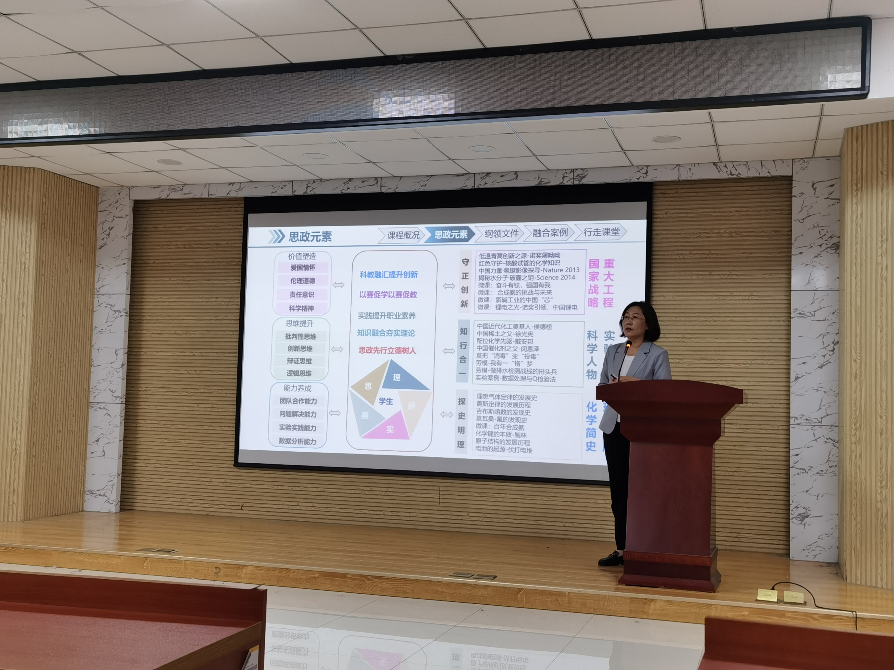 林洁华老师结合自己从事《基础化学原理》的教学经验,从“为什么要开展课程思政建设、如何选取思政素材、如何在教学中融入思政元素”等角度展开讲解。她以国家重大战略工程、科学人物实验实践、化学简史理论发展作为在课程融入思政的主线,通过重构内容、创新方法、拓展环境的渠道深入在课堂中润物无声地实施思政教学。随后,林老师通过课堂教学案例进一步说明如何实施课程思政教学,围绕课程定位和特色,选取了“双碳战略、安全伦理、化学反应方向与钛的制备”三个典型案例进行讲解,并以“行走课堂”案例介绍了如何把课程思政建设与支部党建活动有效融合。最后,林老师以“苔花如米小,也学牡丹开”鼓励老师们要注重日常的思政细节元素,多为课程建设添砖加瓦。