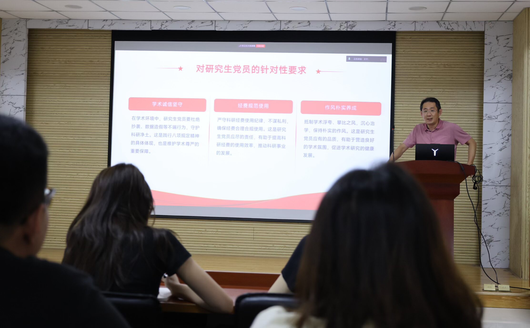 王明辉以《以数理之笔,书写清澈信仰》为主题,结合数理学科特色,深入浅出地阐述了理论知识与理想信念的紧密联系。他勉励全体党员要立足专业、勇于创新,将个人成长与国家发展紧密结合,同时要进一步端正学风、转变文风、改进作风,用实际行动践行党员的使命与担当。