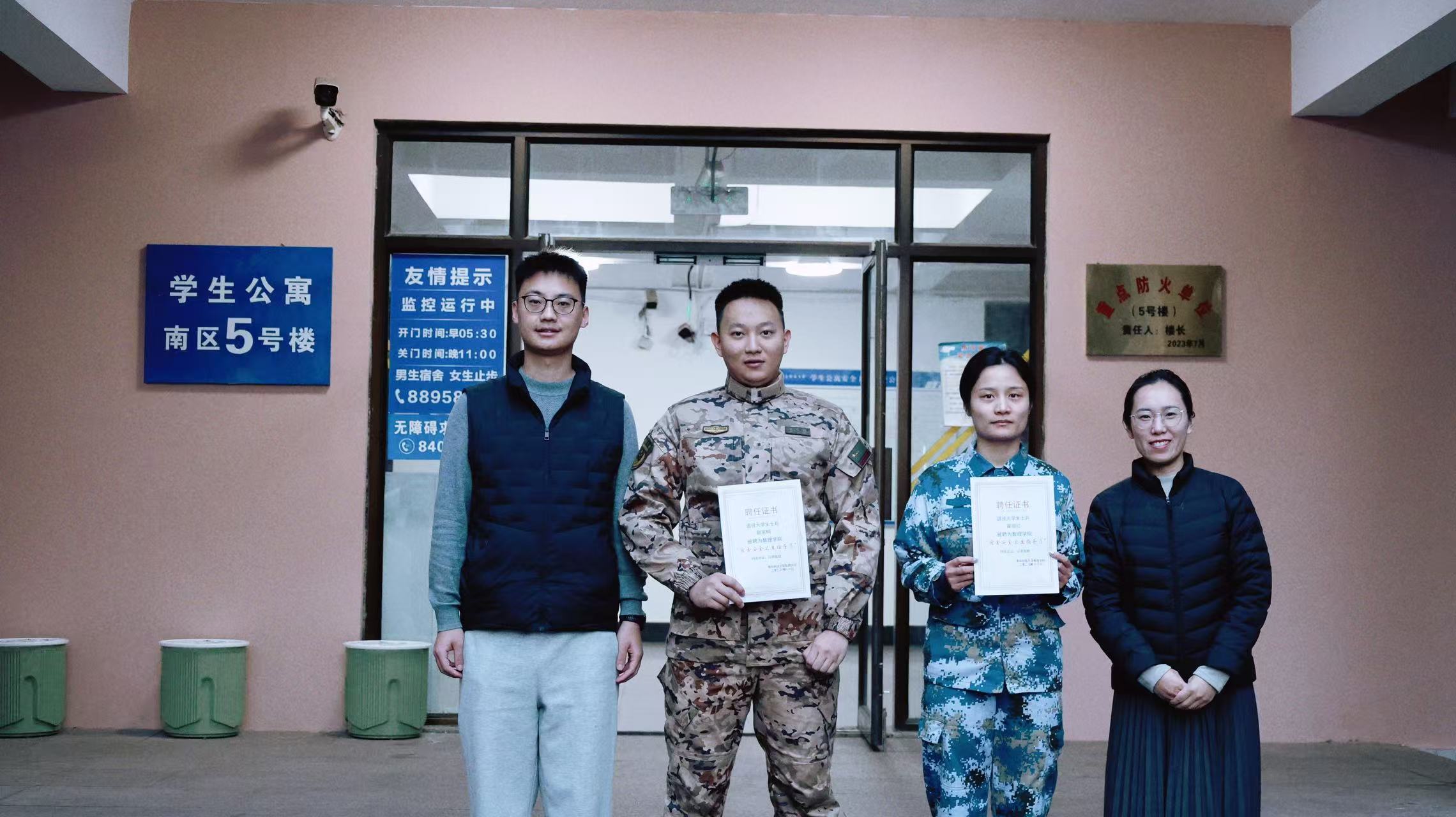 创新学生宿舍管理模式,充分发挥退役大学生士兵优势,正式聘任本科生赵家桐、研究生翟丽红两名同学担任学院首批“宿舍安全卫生指导员”。他们将把部队的优良作风和严格标准带入学生宿舍,助力提升宿舍整体环境,并以此为窗口开展国防教育和入伍动员。