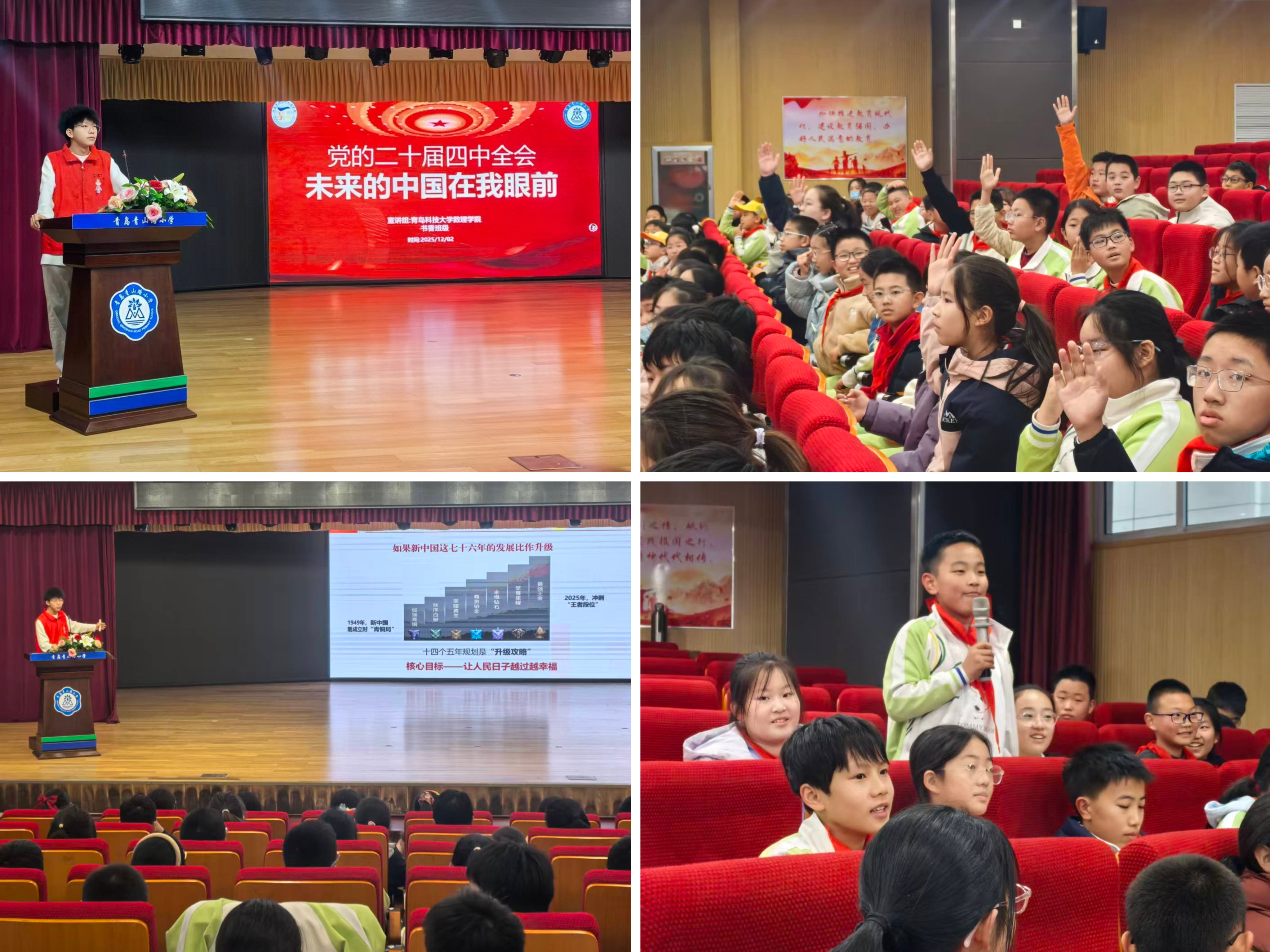 书香班级志愿服务队走进青岛市青山路小学,开展“童言童语话发展,薪火相传向未来”主题宣讲活动,与200余名小学生同上一堂“有温度、接地气”的思政课。