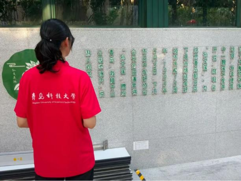 随后,实践队沿扶梯前行,探寻“孙文莲”背后的历史故事。据悉,1995年,日本下关市日中友好协会为庆祝下关市与青岛市缔结友好城市25周年,将孙中山先生手赠的莲子培育而成的“孙文莲”移栽至中山公园池塘内。在池畔,实践队队员们集体诵读《采莲曲》,“荷叶罗裙一色裁,芙蓉向脸两边开”的经典诗句回荡其间,大家在“出淤泥而不染”的文化意境中,体悟廉洁品格的跨文化共鸣与精神传承。