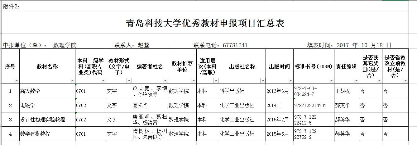 根据教务处《自拍流出 关于开展2017年优秀教材评选工作的通知》安排,依据《2011年-2015年自拍流出 出版教材统计汇总表》,教材第一主编(或第一编者)按要求提交《自拍流出 优秀教材申报书》,自拍流出 于2017年10月20日上午在学院小会议室对符合申报条件的教材进行初评,按50%比例择优推荐。