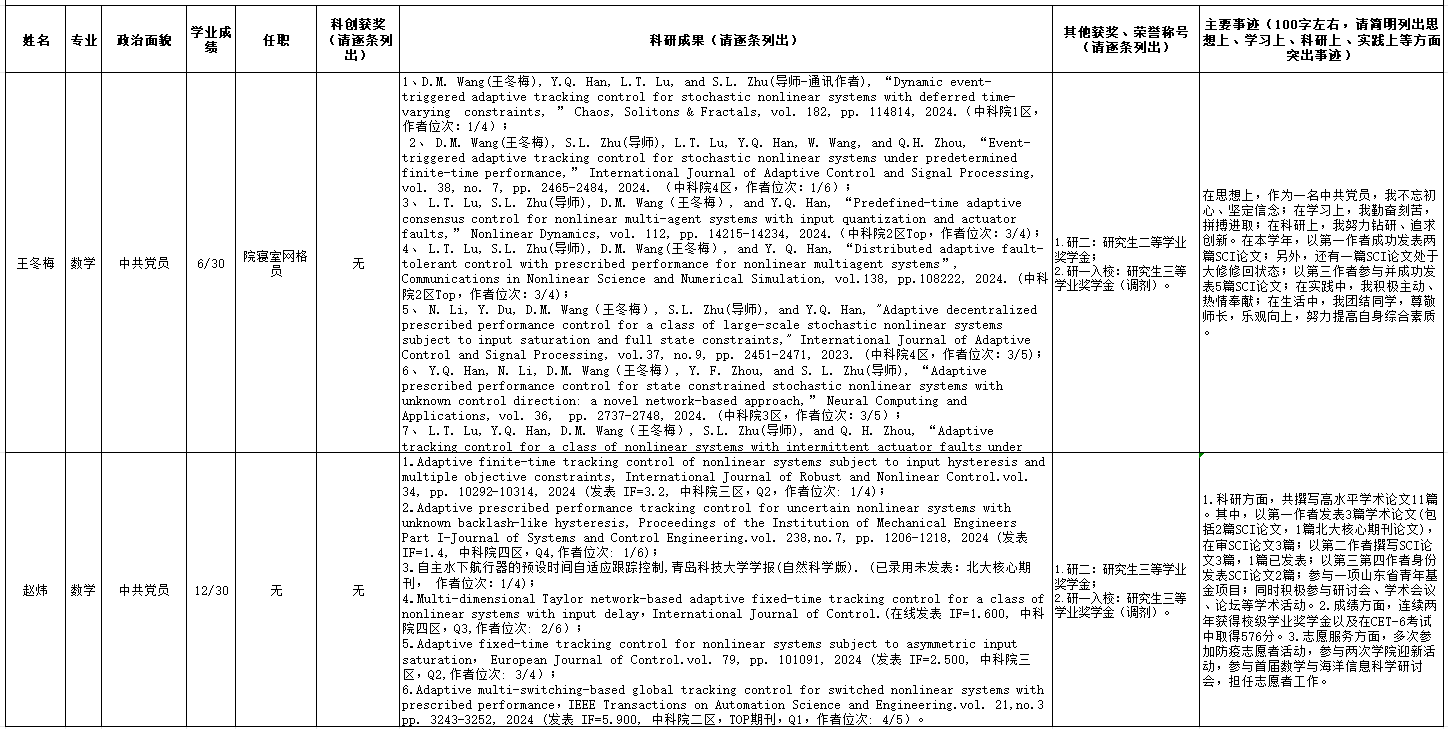 根据《山东省学生资助资金管理办法》《省教育厅省财政厅关于扩大省政府奖学金覆盖范围的通知》《山东省学生资助管理标准》和相关奖学金评审办法规定,依据《山东省教育厅关于开展2024年奖学金评审工作的通知》(鲁教财函[2024]71号)和学校《关于开展2024年研究生国家奖学金评选工作的通知》的有关要求,经学生申请、材料审核、答辩评审,以及学院研究生国家奖学金评审委员会审议讨论,2024年研究生国家奖学金学院初评已结束,现将评审结果进行公示: