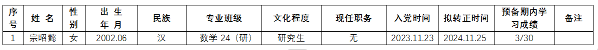 根据本人申请,党组织培养,经自拍流出 研究生党支部研究,支部大会讨论并无记名投票表决,自拍流出 党委审核,拟将宗昭懿同志转为中共正式党员,现将其有关情况予以公示。