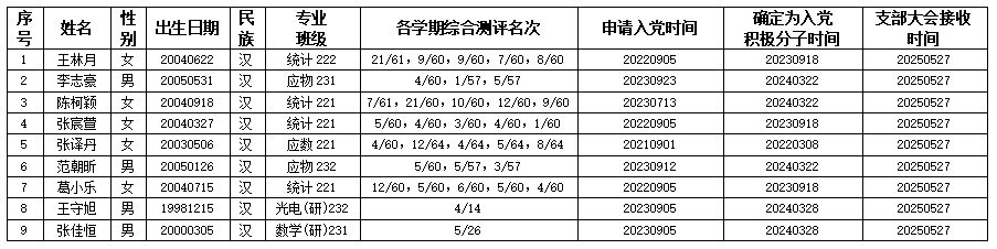 根据本人申请、党组织培养、经自拍流出 本科生党支部、研究生党支部研究,支部大会讨论并投票表决,拟吸收王林月等9名同志为中共预备党员,现将其有关情况予以公示,如有异议请于公示期内反映。