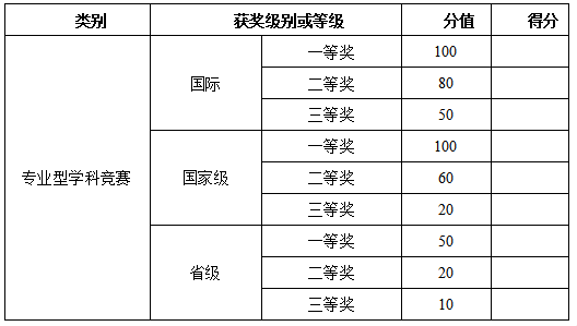 科技竞赛得分根据学生参与的各类学科竞赛获奖情况进行考核,最高累计分值不超过100分,按如下细则计算: