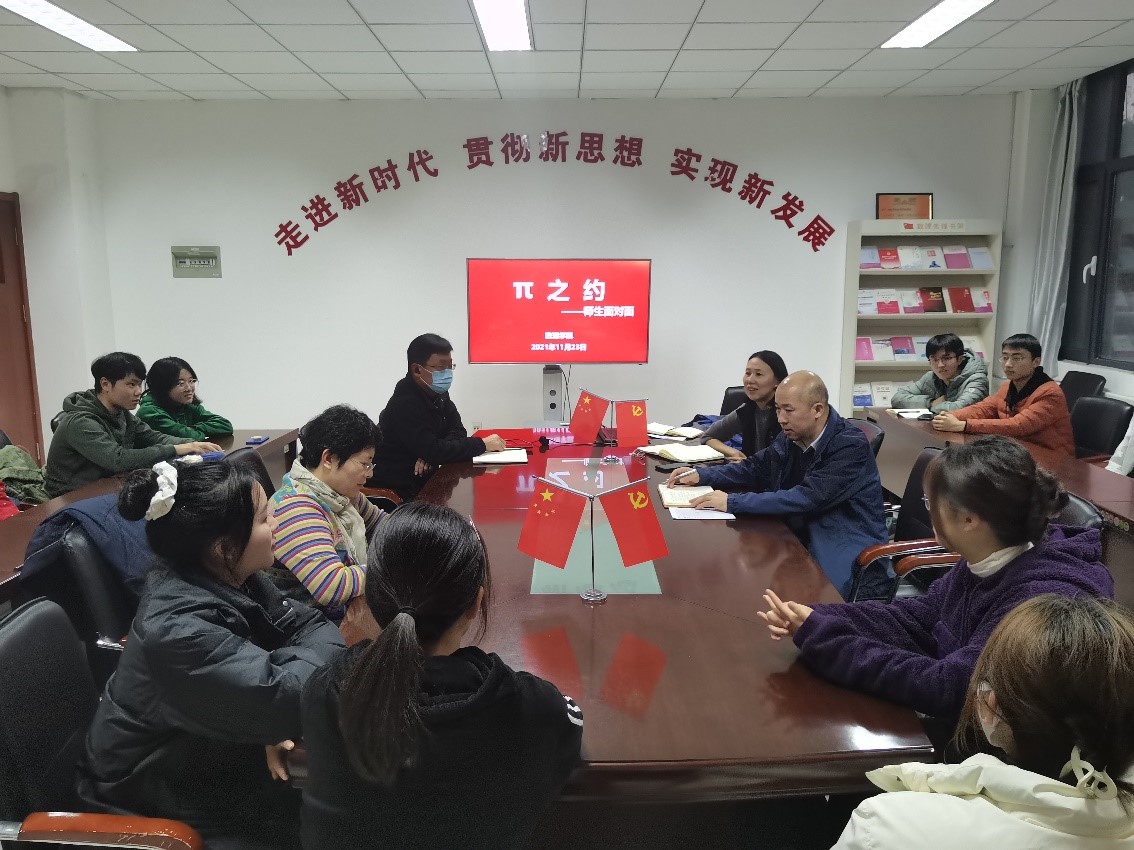 在学院会议室举办“π之约”——师生面对面,院长杨树国、党委书记李淑贞、副院长王明辉、副院长郭广海、数学系主任李秀丽、物理系副主任王茂榕、学工办主任李磊,部分2021级学生代表参加座谈会。