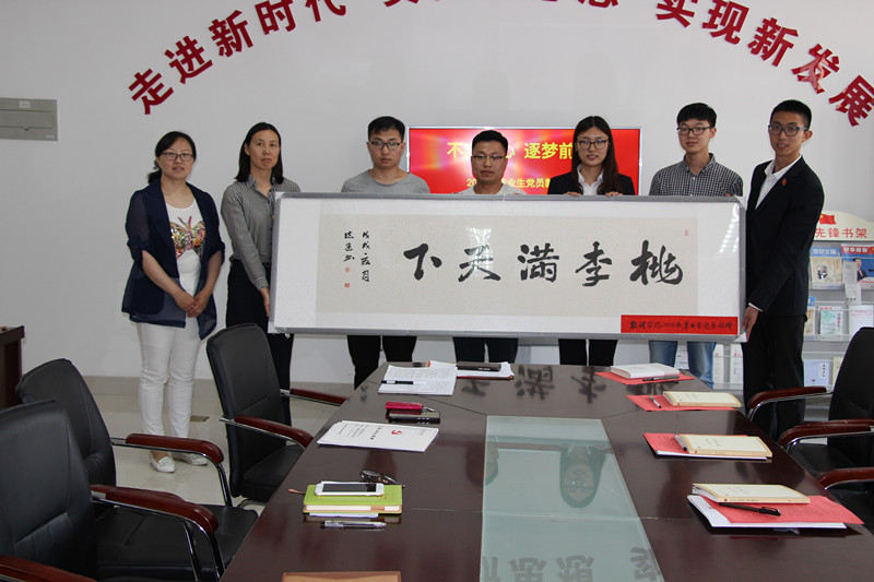 党总支为每位毕业生党员赠送一本《共产党宣言》,扉页上记录了每位毕业生的入党时间和领导、辅导员寄语,希望每位党员同志都能铭记党员身份,牢记入党初心。毕业生党员为学院赠送“桃李满天下”的牌匾。