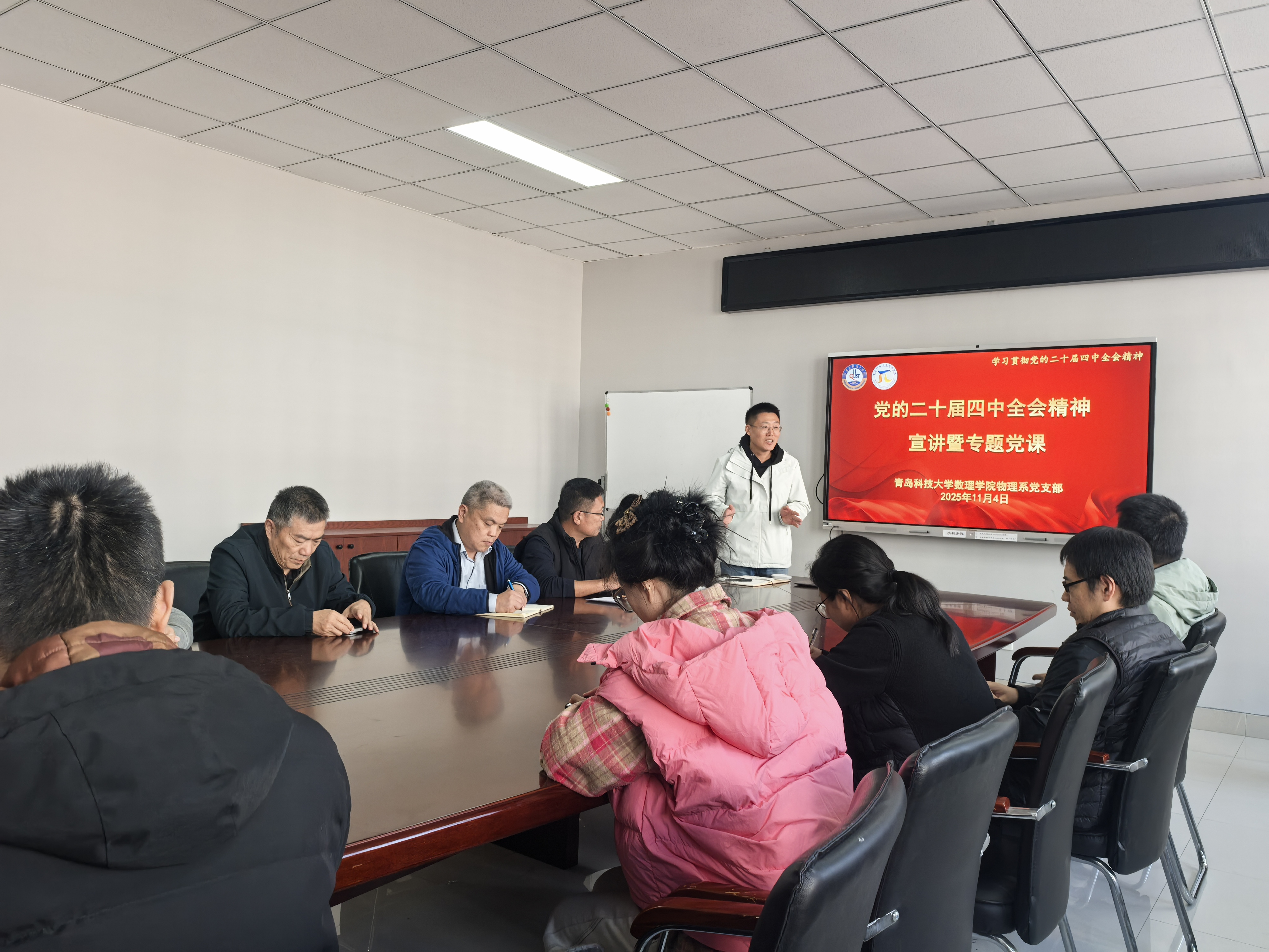 为深入学习贯彻党的二十届四中全会精神,准确把握全会核心要义与战略部署11月4日,自拍流出 物理系党支部举办“党的二十届四中全会精神宣讲暨专题党课”学习活动。物理系党支部书记吕浩主讲,副院长郭广海作总结讲话,支部全体党员参加学习。