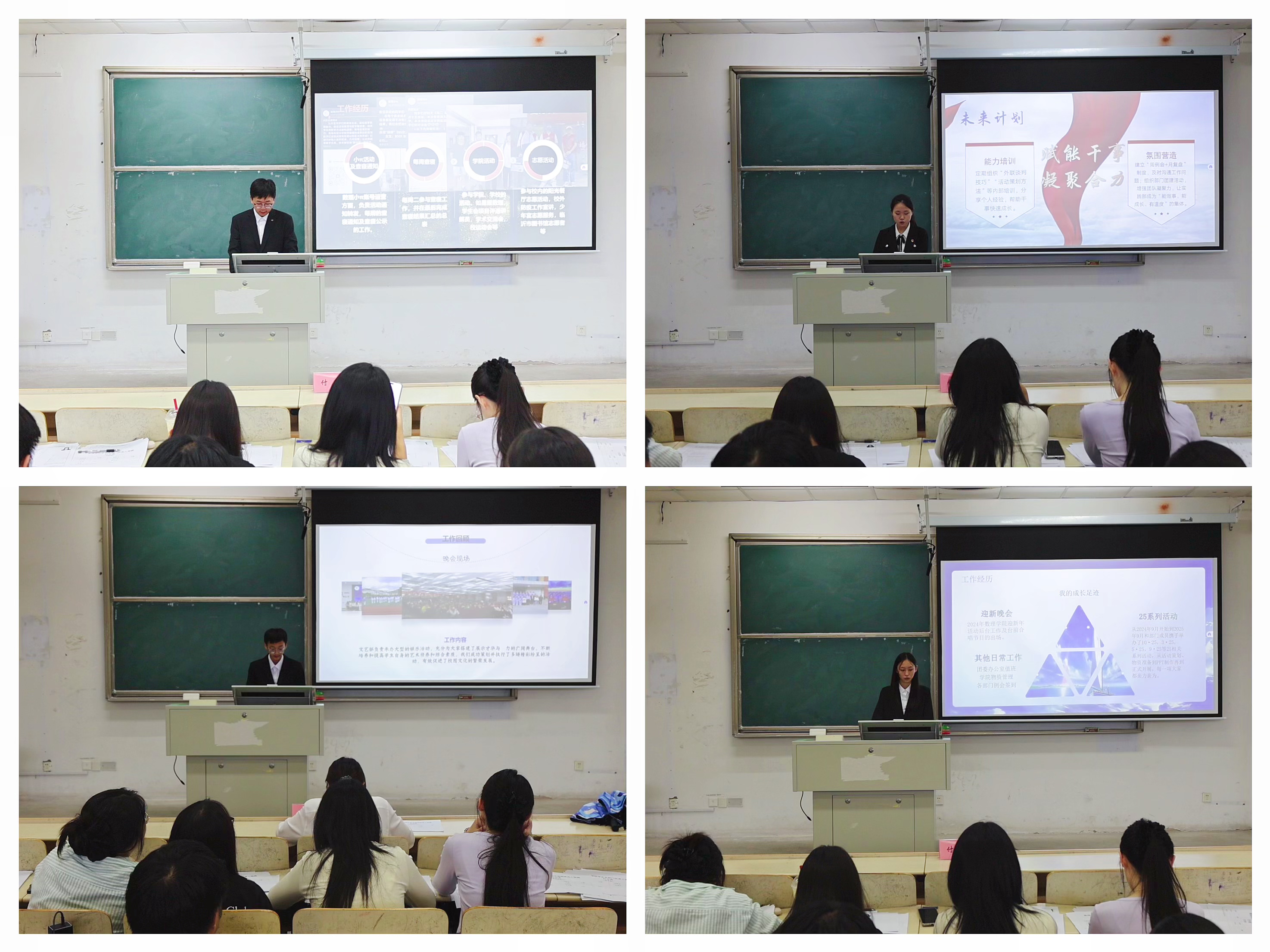 在答辩环节,指导老师及主席团成员针对各部门的汇报进行了提问和点评,就工作亮点、存在问题及改进方向与各部门负责人进行了深入交流,提出了许多建设性的意见和建议。在总结讲话中,付凯对学生会全体成员过去一学年的辛勤付出和取得的丰硕成果表示充分肯定。她指出,本次答辩不仅是一次工作的检阅,更是一次宝贵的交流学习和能力提升的机会。她希望学生会在新学年里,一是要继续强化思想引领,坚守服务同学的初心;二是要勇于改革创新,打造更具数理学科特色的品牌活动;三是要加强内部建设,提升团队凝聚力和工作效率;四是要深化服务内涵,更精准地回应和满足同学们的成长发展需求。